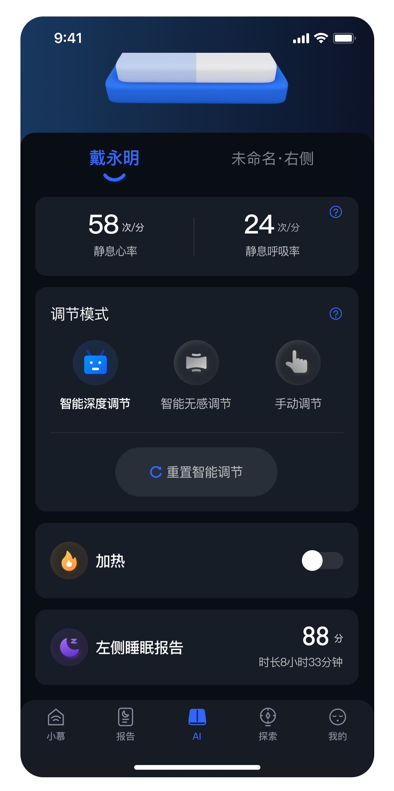 检测用户睡眠心率、呼吸、深浅睡眠等数据,自动分